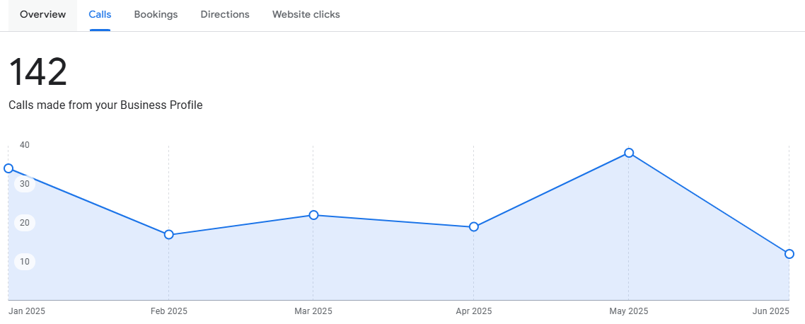 The graphic below shows Google Business Profile calls (January - June 2025) where we helped the company get 142 calls for just one Google Business Profile.
